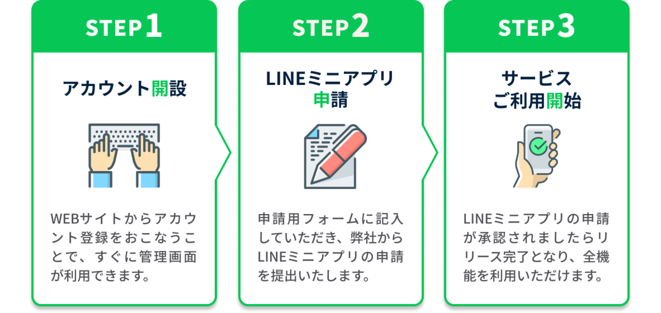 お申込み・お支払いからアカウントの運用開始までの目安は、LINEからの承認の都合上、1~2週間を目途にご案内しております。その期間で管理画面で初期設定や拡張機能の追加が可能です。