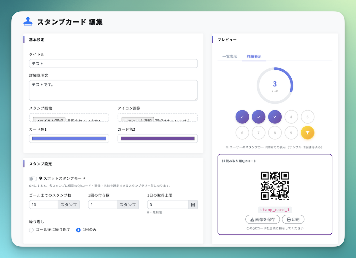 管理画面の「スタンプカード」メニューから新規作成を行います。